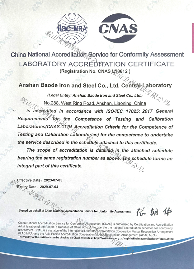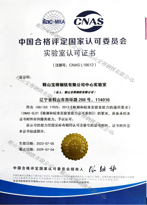 喜訊!鞍山寶得鋼鐵有限公司中心實驗室獲得 CNAS實驗室認可證書